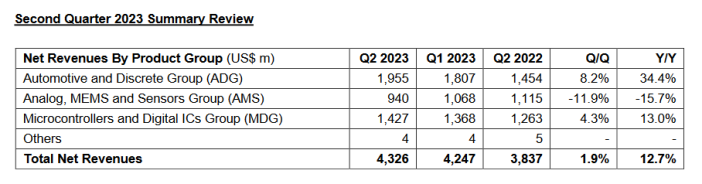 意法半導(dǎo)體第二季度凈收入同比增長12.7%的原因是,主要得益于汽車和工業(yè)業(yè)務(wù)的持續(xù)強(qiáng)勁增長。具體來看,汽車與離散元件營收額達(dá)到19.6億美元,同比增長34.4%,實(shí)現(xiàn)四個季度連增。